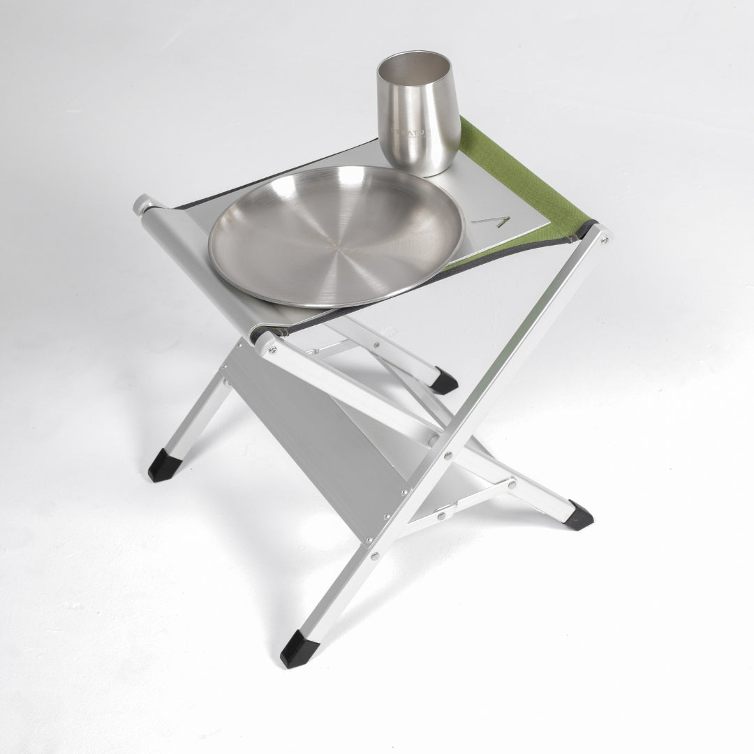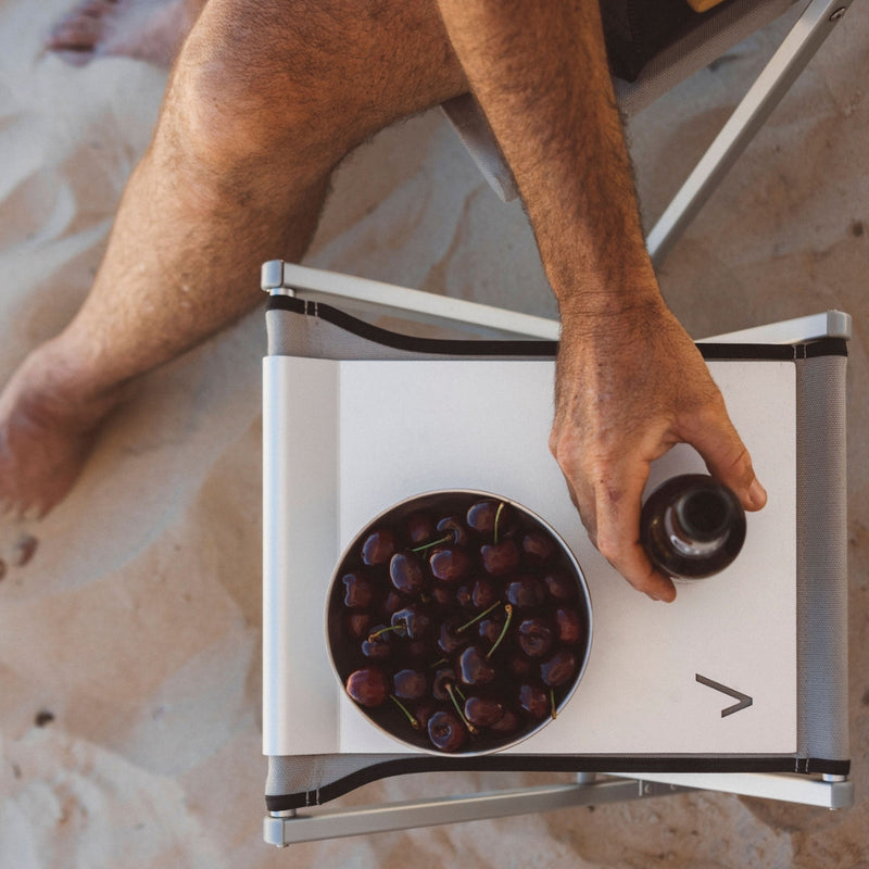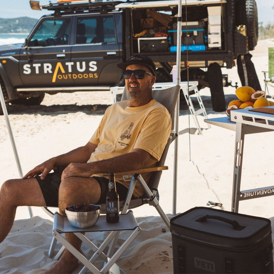 Smoko is sorted with the Camp Stool Buddy - a simple alloy attachment that transforms your stool into a sturdy tabletop.
