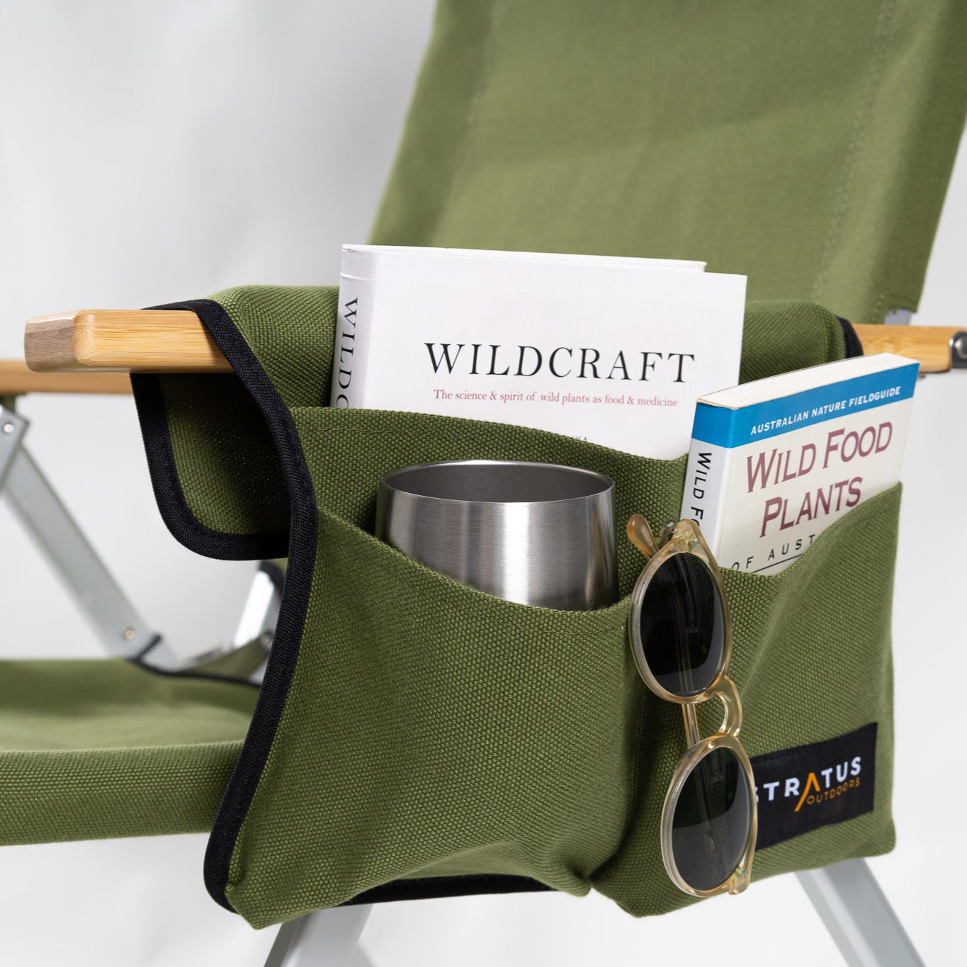 This neat little organiser clips over the arm of our chairs and sorts out your life. Can hold your drink in cup or bottle without tipping, a book, ipad or secret chocolate stash, no worries. No need to remove it from the chair before folding it up either.