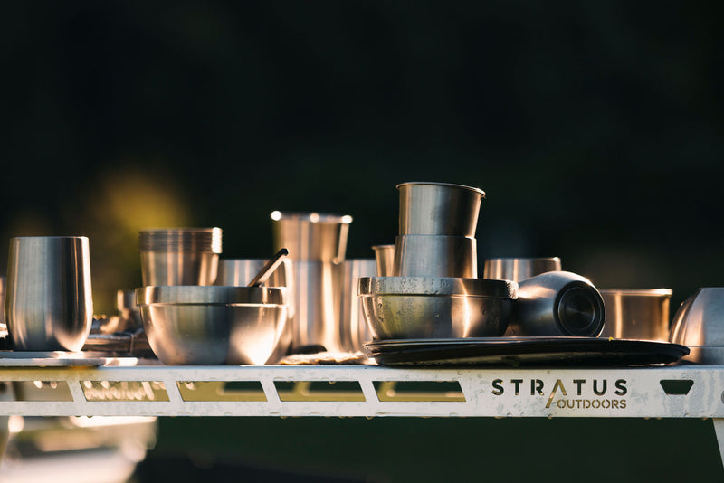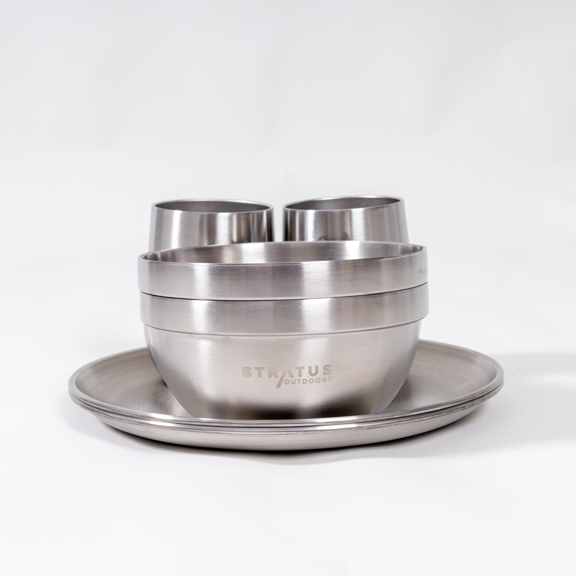 The Stratus Outdoors Dinnerware sets are made from 304 grade Stainless Steel to produce an extremely durable, premium rust resistant set.