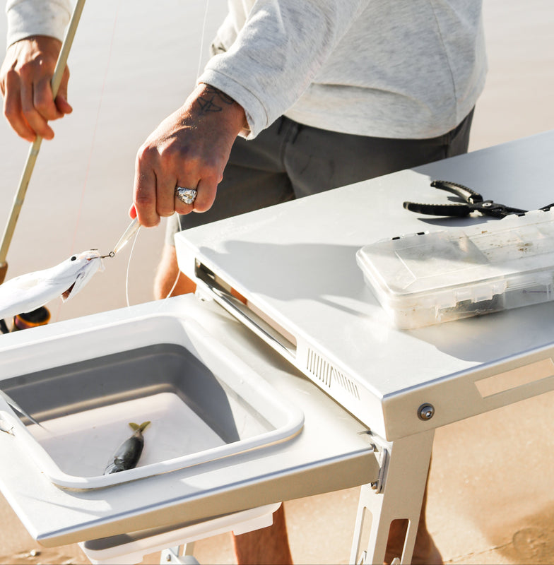 This super strong + light weight Alloy Table is made of brushed 3mm Aluminium and stainless steel fixings. The ocean spray isn’t going to worry Big D, neither is the weight of your camping gear. Perfect to prep your camp fire meal, fillet your catch of the day, or store your gear off the ground.